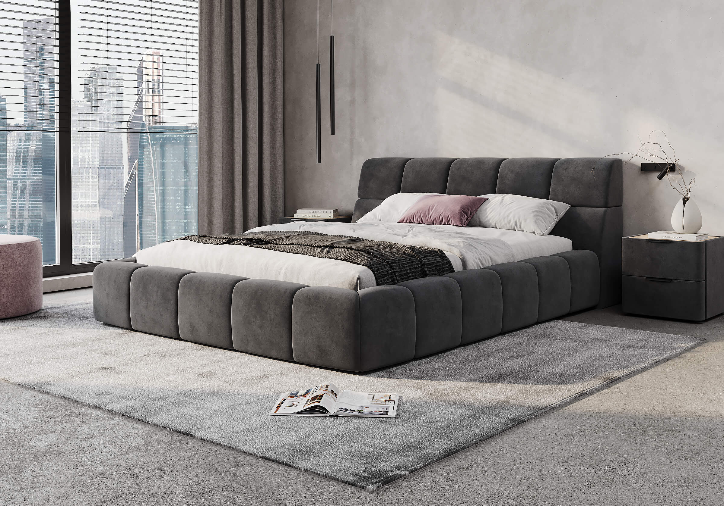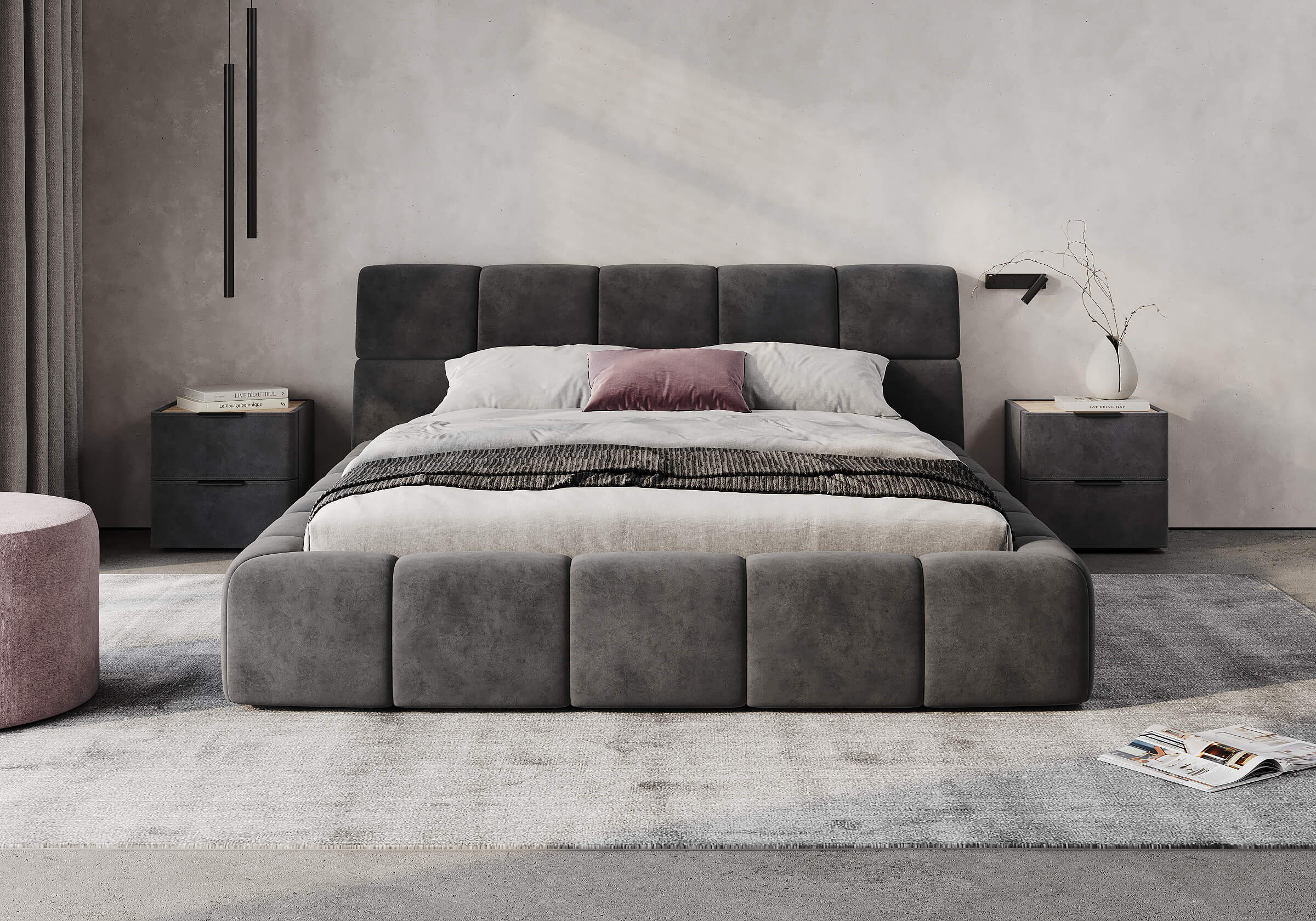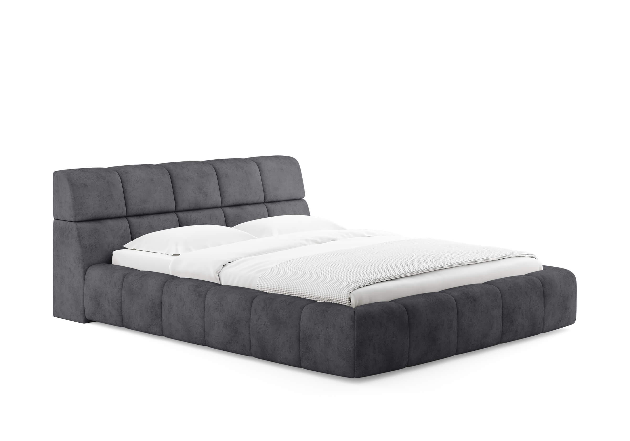 Изголовье выполнено в виде скруглённых квадратов. Модульное мягкое изголовье придают кровати дизайнерский вид.