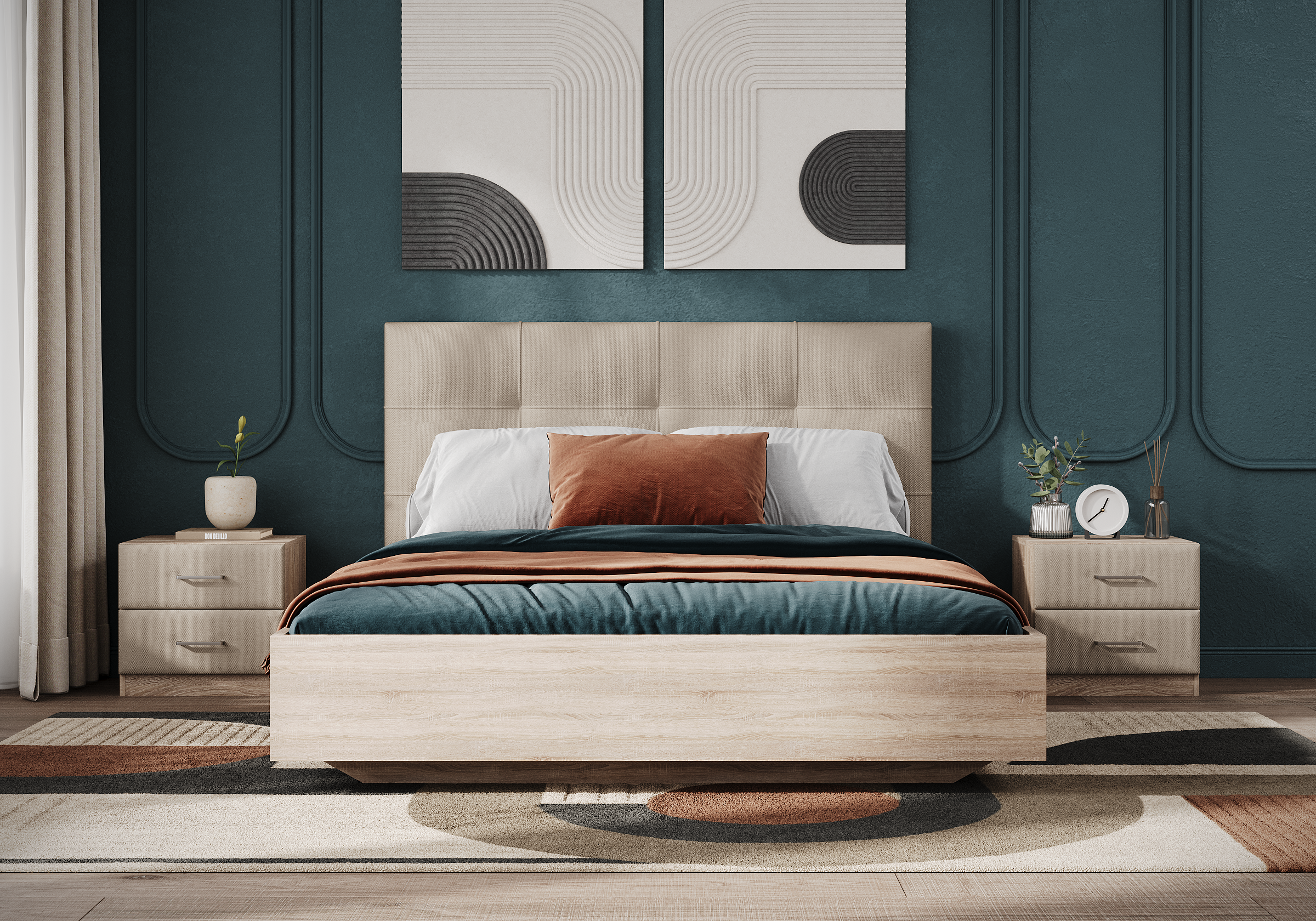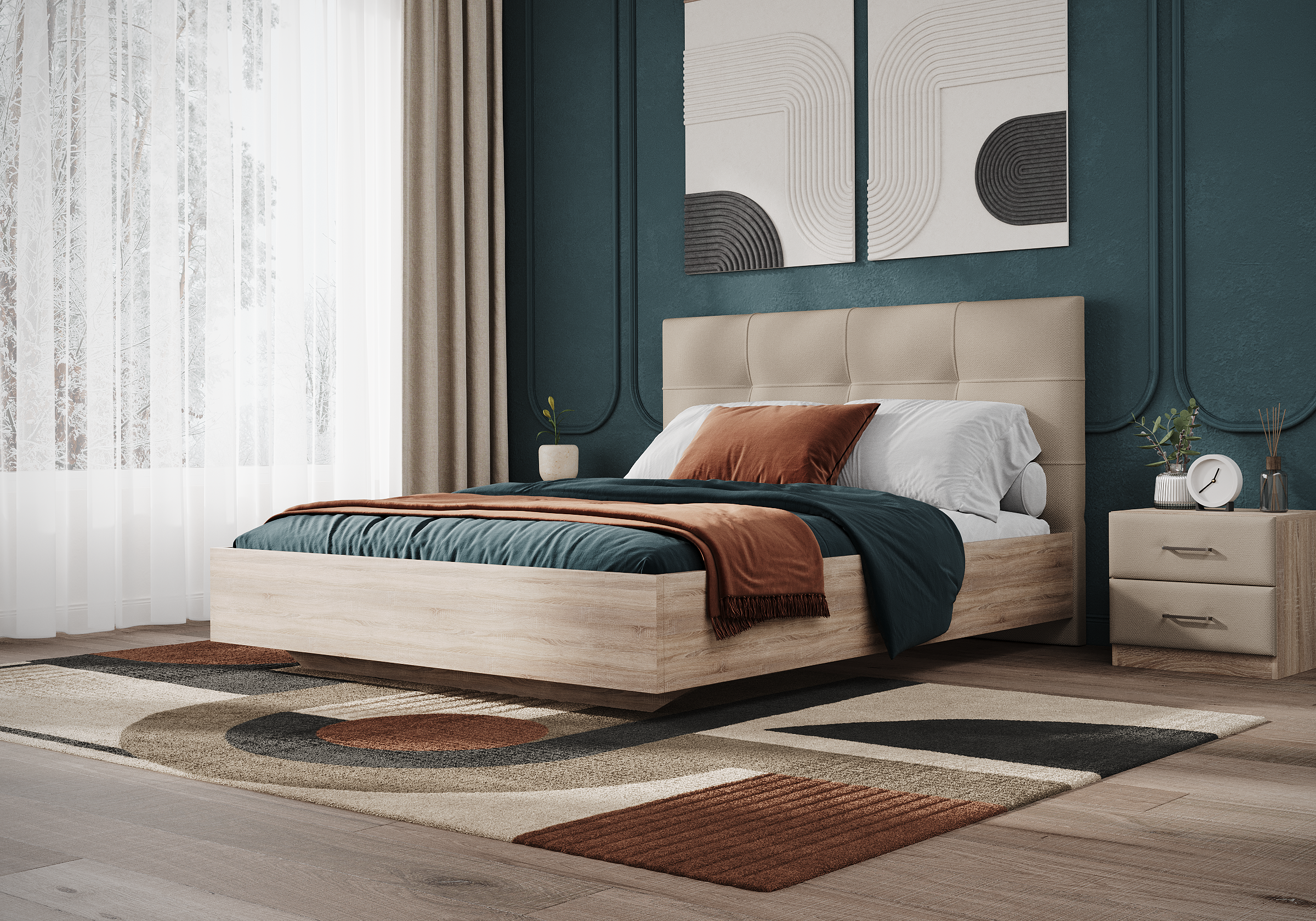 Царги из ЛДСП увеличенной толщины придадут строгость и надежность. Благодаря сочетанию усиленных металлических уголков, ребер жесткости и эксцентриковой стяжке конструктив кровати получается жёстким и прочным.